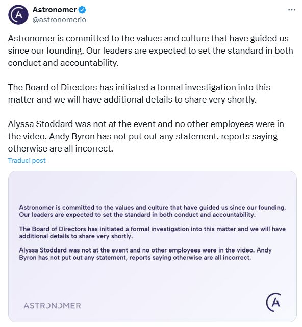 In risposta al clamore suscitato dal video, Astronomer ha deciso di intervenire ufficialmente. L’azienda ha comunicato attraverso un post su X (ex Twitter), dichiarando di aver avviato una indagine formale sulla vicenda. Nella dichiarazione, Astronomer ha sottolineato l’importanza dei valori aziendali e della cultura che guidano l’organizzazione, precisando che ci si aspetta che i propri leader stabiliscano standard elevati in termini di comportamento e responsabilità. Inoltre, l’azienda ha promesso di aggiornare il pubblico sui progressi dell’indagine, pur mantenendo riserbo sui dettagli.